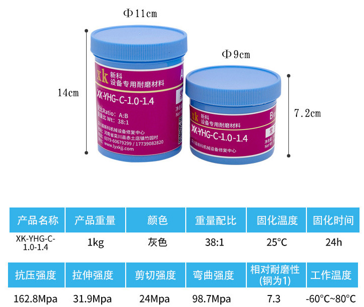 1.先預(yù)熱已噴砂的設(shè)備,再將XK-YHL-1.0高分子耐磨顆粒膠按比例混合攪拌均勻,用批刀或塑料刮板對(duì)磨損部位進(jìn)行修復(fù);