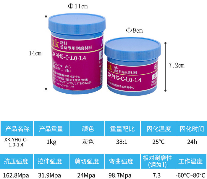 1.先預(yù)熱已噴砂的設(shè)備,再將XK-YHL-1.0高分子耐磨顆粒膠按比例混合攪拌均勻,用批刀或塑料刮板對(duì)磨損部位進(jìn)行修復(fù);